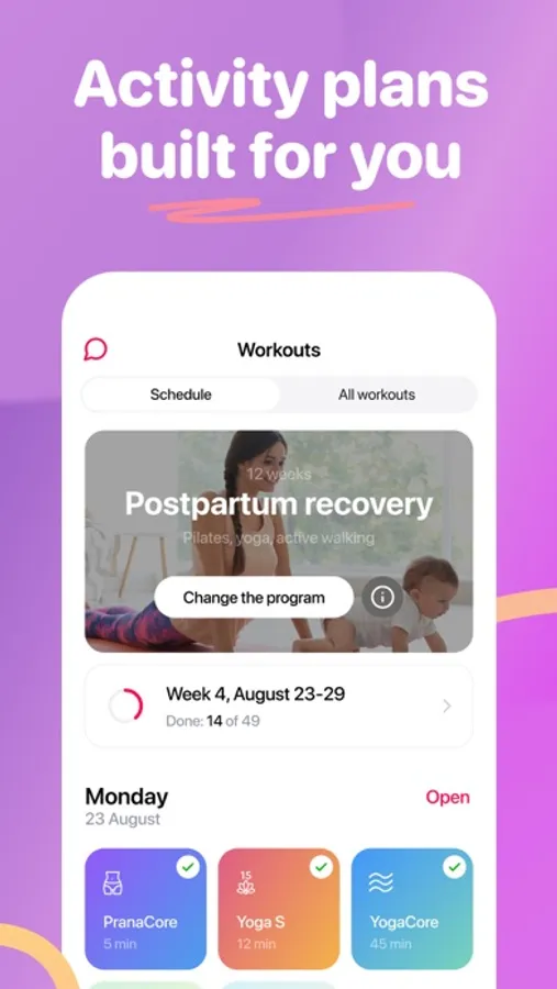 - Ability to connect options with your activity level: yoga for pregnant women, workouts for pregnant women or young mothers