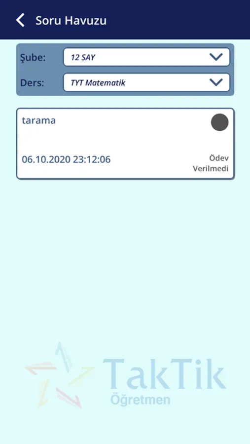 Milli Eğitim Bakanlığı Talim Terbiye Kurulu tarafından belirlenen konu ve kazanımlarla eşleştirilmiş binlerce sorudan test oluşturabilir bu testleri ödev olarak verebilirsiniz. Testlerin Pdf çıktılarını alabilirsiniz. Öğrencilerin ödev durumlarını kontrol edebilir doğru yanlış sayılarına bakabilirsiniz.