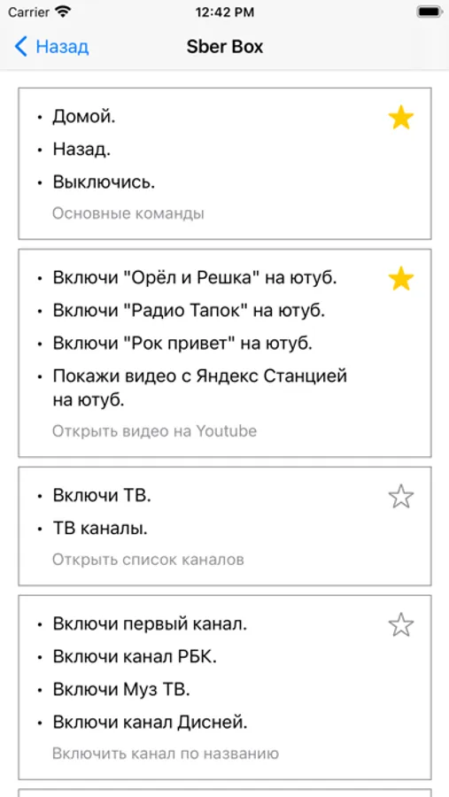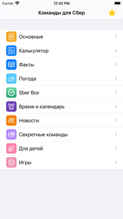 Основные. Калькулятор. Факты. Погода. Сбер Банк. Сбер Бокс. Сбер Портал. Умный дом. Время. Календарь. Новости. Для детей. Игры. Секретные команды.