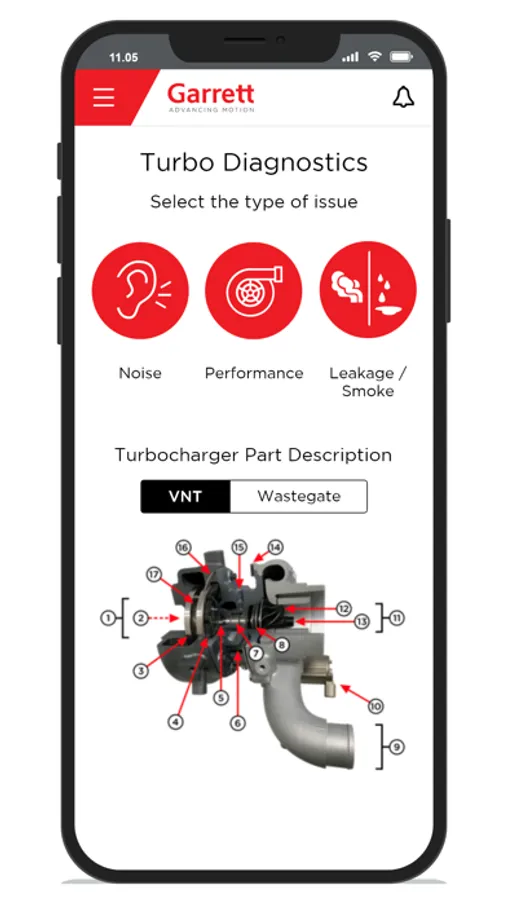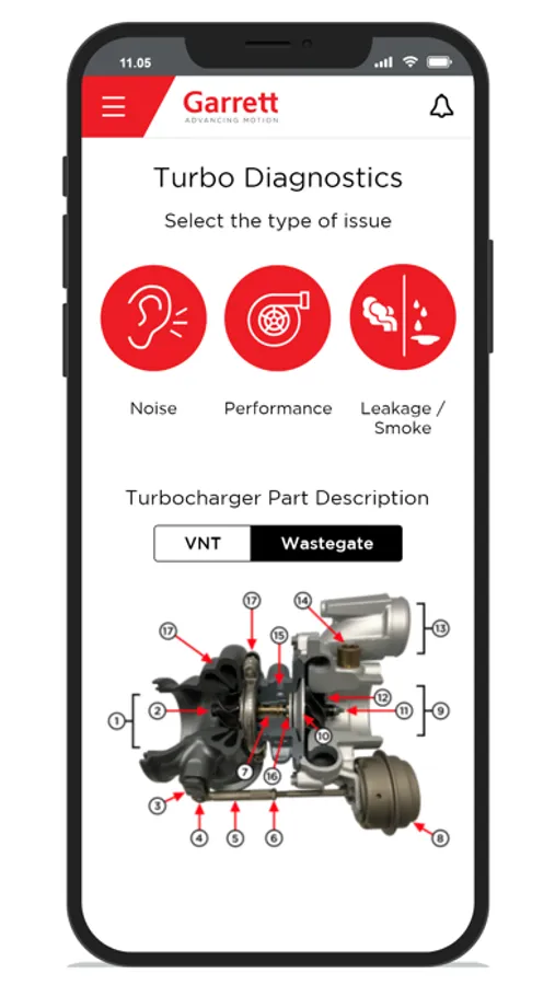 Using Garrett Turbo Diagnostics tool you will be guided through a series of tests and potential issues to uncover malfunctions and you'll receive the suggested actions. You can generate your own report and save it as a PDF file on your device.