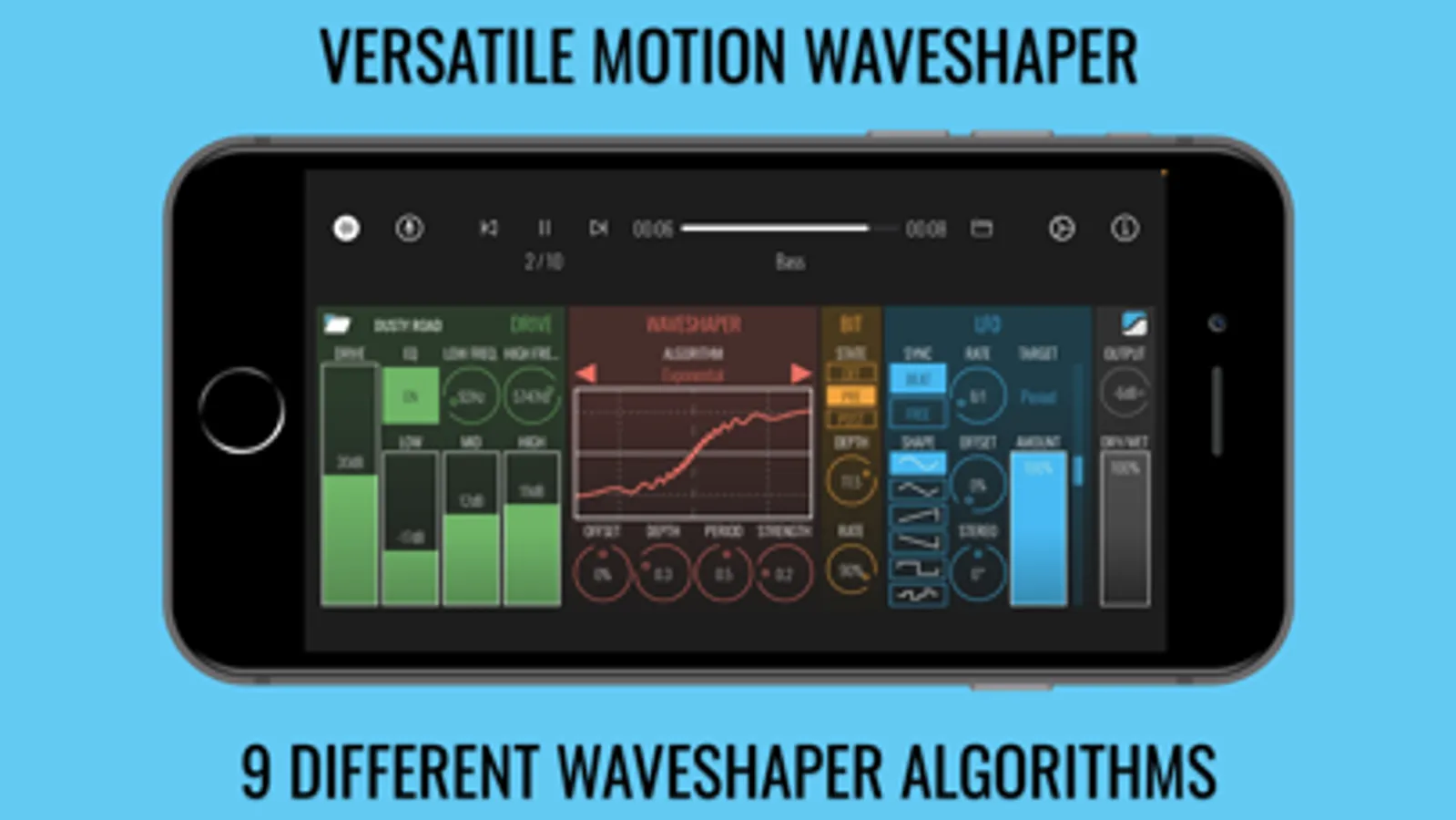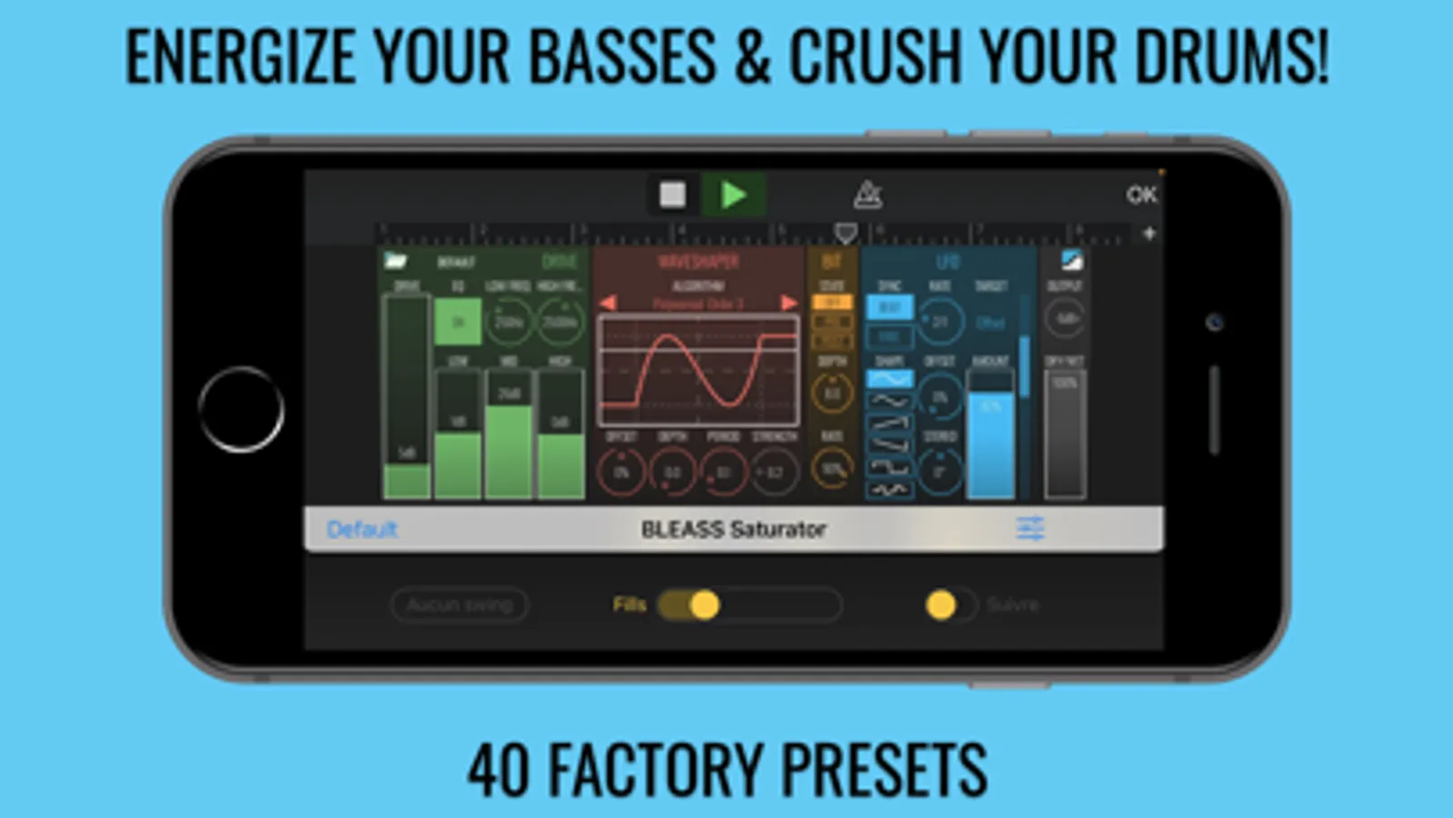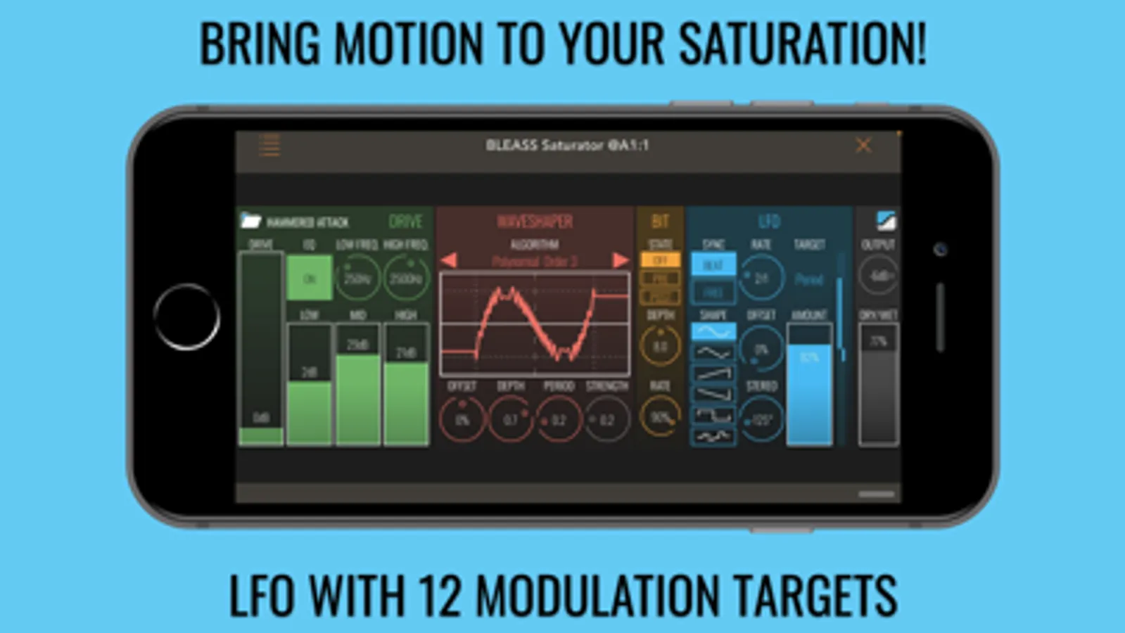 The BLEASS Saturator AUv3 Effect Plugin features a semi-parametric gain drive, 9 different WaveShaper algorithms, a Pre/Post Bitcrusher, and a LFO to bring motion to your saturation!