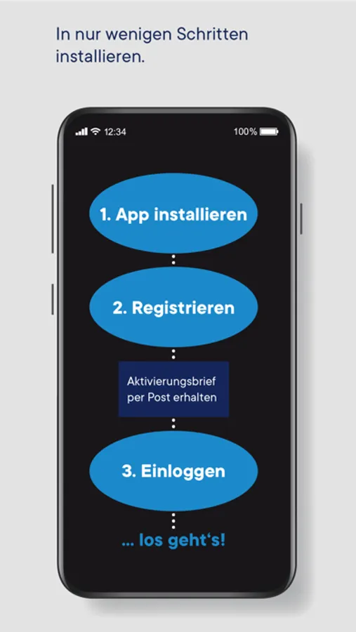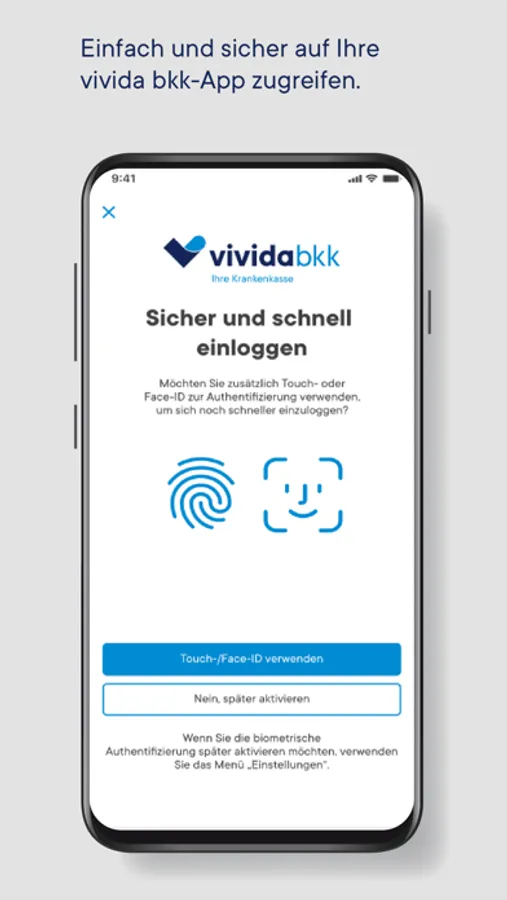 Nach dem einmaligen Registrierungsvorgang ist die Anmeldung in der App über den bei der Regist-rierung selbst vergebenen PIN oder biometrische Daten (Face-ID oder Fingerabdruck) möglich.