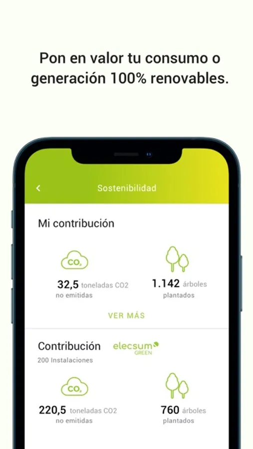 Conoce tus indicadores de sostenibilidad (emisiones de CO2 evitadas y equivalencia en árboles plantados), accede a tu sello renovable exclusivo y compártelo con quien quieras para demostrar a todo el mundo tu compromiso en combatir activamente los efectos del cambio climático.