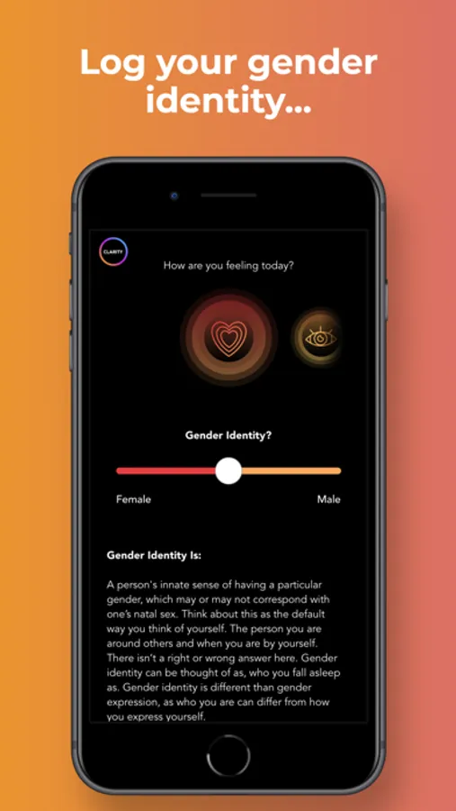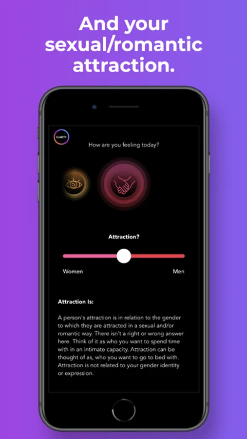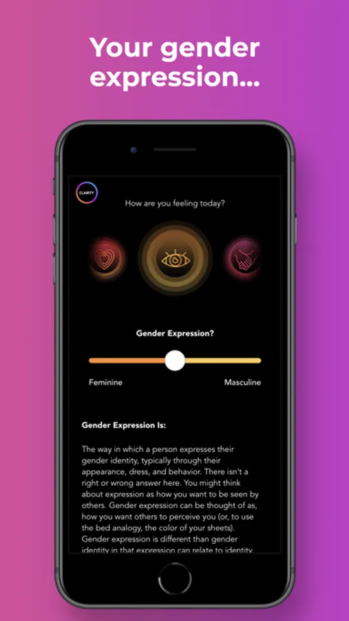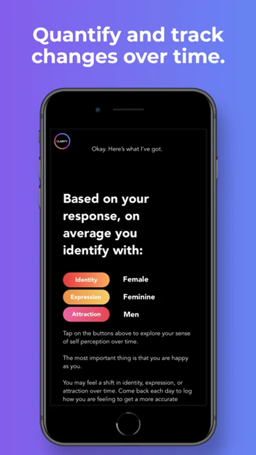 Using Clarity, you will follow a guided experience through different aspects of self-identity. You’ll start by using a series of sliders to input where you feel you fit on the spectrums of gender identity, gender expression, and attraction. The app then aggregates this input to give you some guidance and insights. If you are questioning your identity, your self-perception may fluctuate over time as you experiment and discover what feels right and what doesn’t. As you go through this process, you can return to Clarity and update the responses.