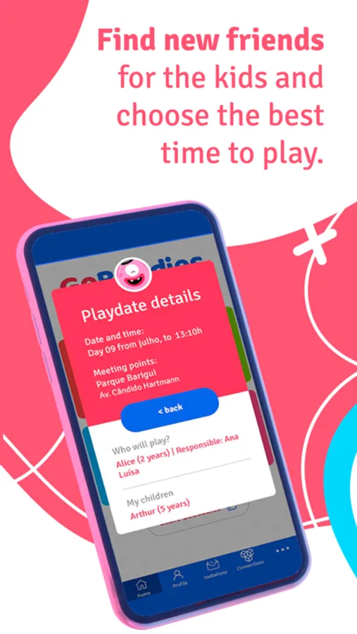 GoBuddies aims to encourage the socialization of children from their parents or legal guardians, who will schedule and monitor their children in playdates (games or sports activities), according to their availability.