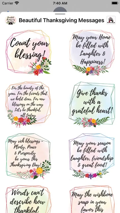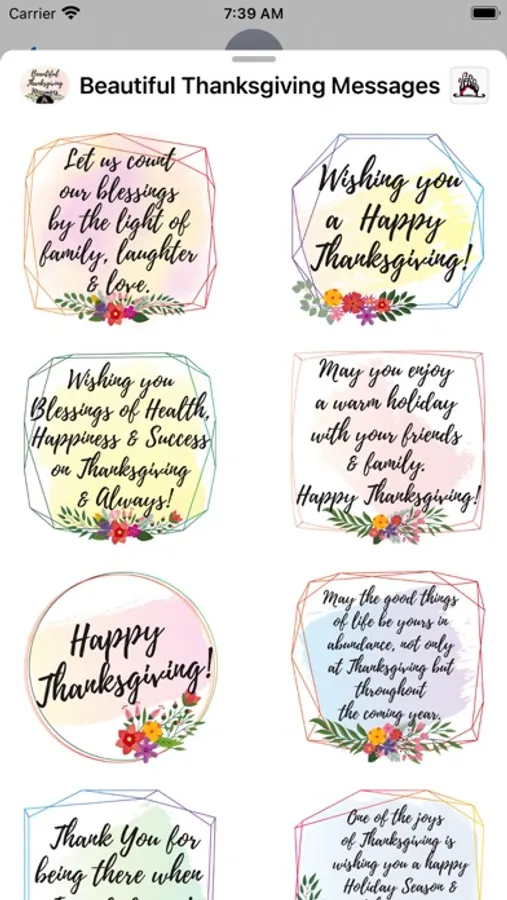 Make your text message more personal today, add those crafty feelings to the technology you are using with this iMessage Stickers pack that comes with a beautiful and colourful watercolour background, combine with well-designed frames and flowers. This stickers pack comes with 40 useful thank you greetings and quotes to show your gratitude that you can send to your friends and family, and anyone in your life that you want to show your love and appreciation to, especially during thanksgiving time.