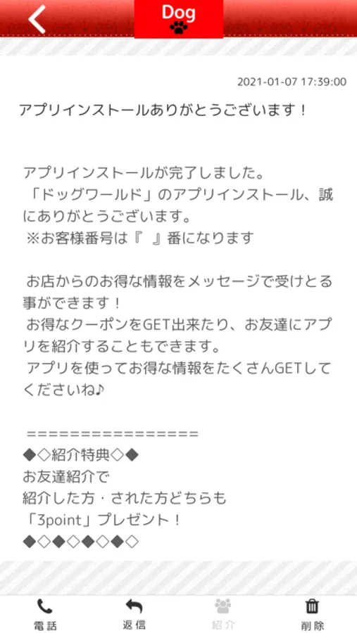 ドッグワールドのアプリをSNSを通じてお友達に紹介する事ができます。