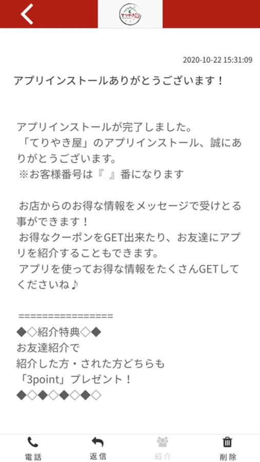てりやき屋のアプリをSNSを通じてお友達に紹介する事ができます。