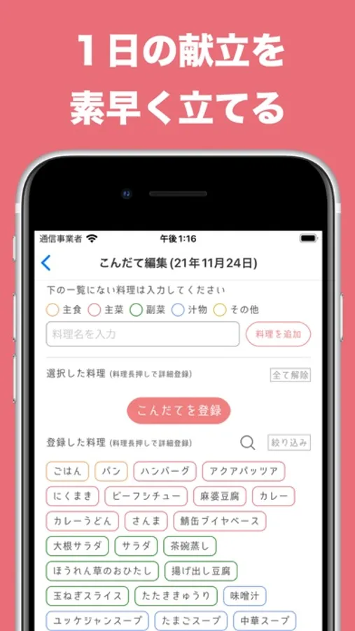一度入力してしまうと次からは一覧から選んで1タップするだけで献立に組み込めます。