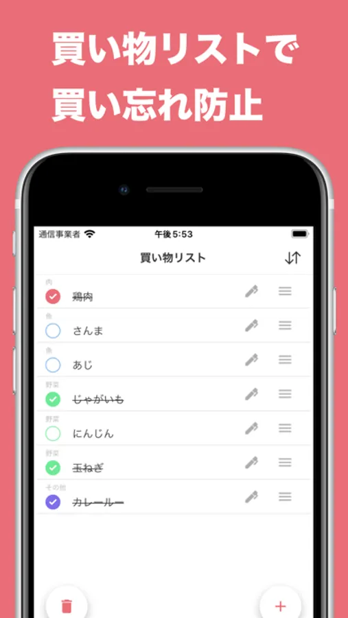 ・買い物リスト・メモの並び替え(三本線アイコンの長押し)
