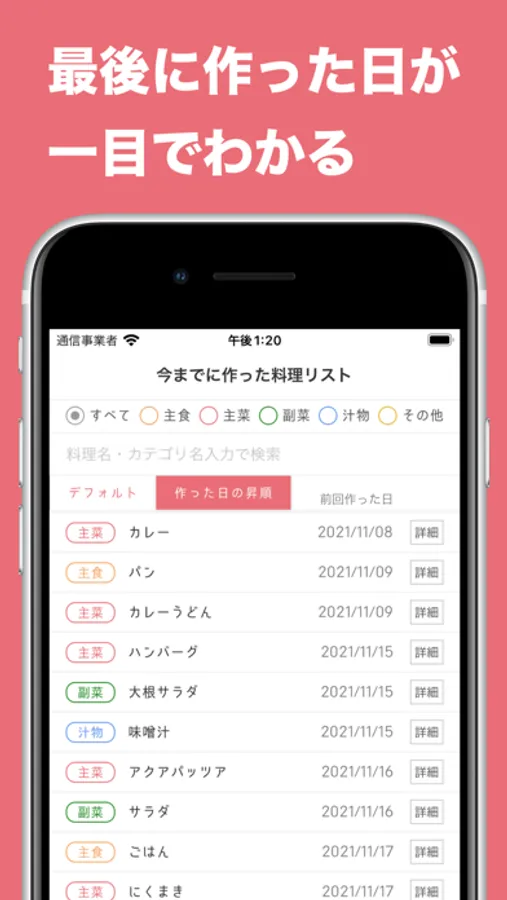 ・主食、主菜、副菜、汁物、その他で料理のカテゴリ分け