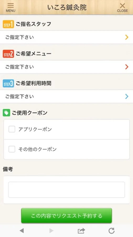 希望のメニュー・日時を指定して送信するだけで予約を依頼できます。