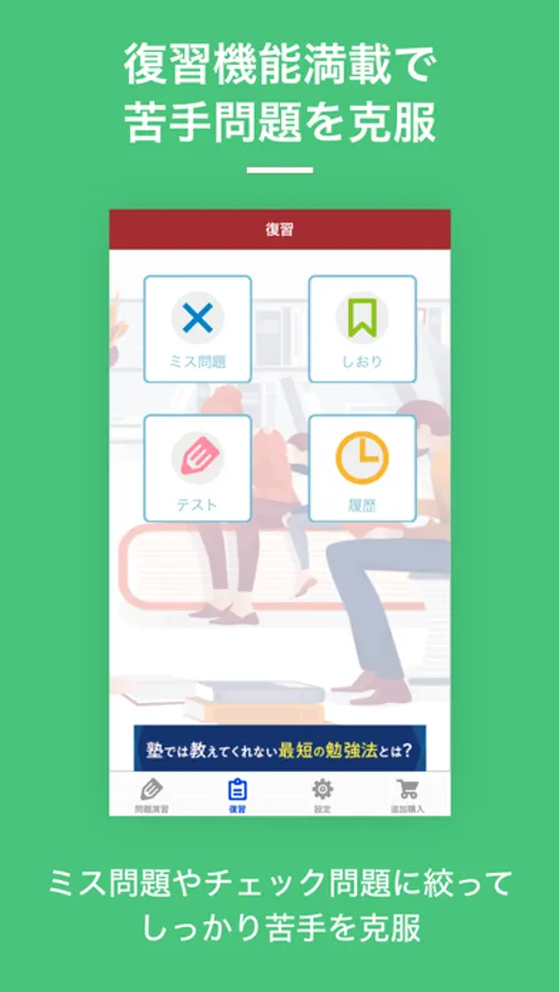 テスト機能はもちろん、ミス問題だけを復習、苦手な問題をチェックして、チェック問題のみ復習もできます。