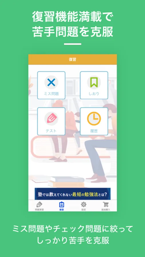 テスト機能はもちろん、ミス問題だけを復習、苦手な問題をチェックして、チェック問題のみ復習もできます。