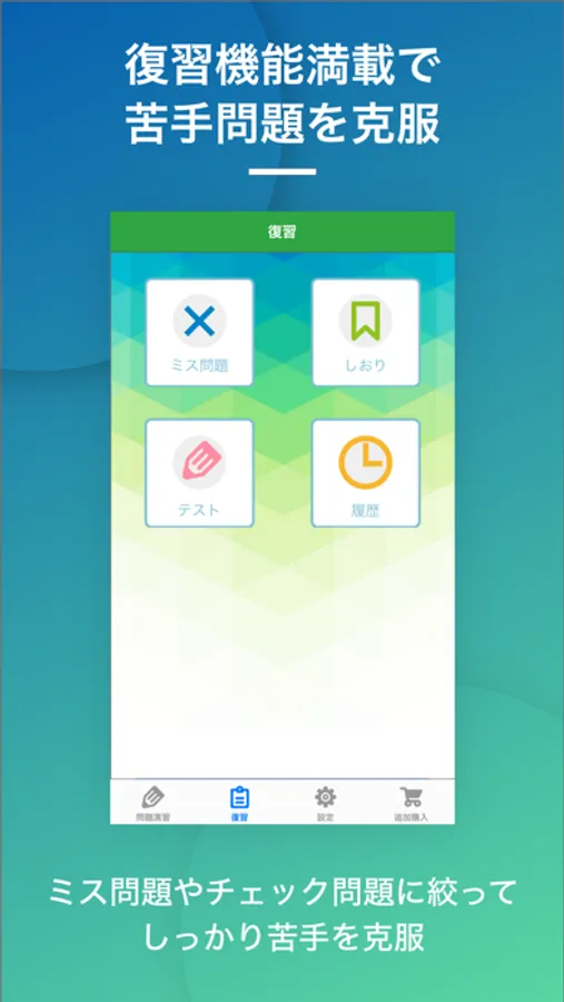 テスト機能はもちろん、ミス問題だけを復習、苦手な問題をチェックして、チェック問題のみ復習もできます。