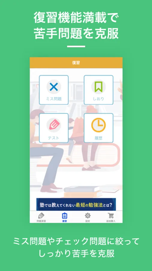 テスト機能はもちろん、ミス問題だけを復習、苦手な問題をチェックして、チェック問題のみ復習もできます。