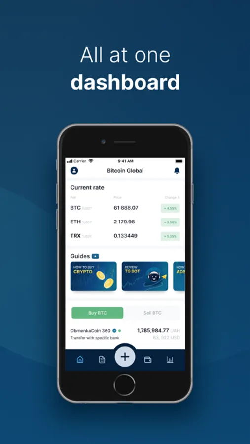 In the Bitcoin Global app, you can track the rate of cryptocurrencies online right in the app. This is useful if you want to actively trade and understand the state of the market.