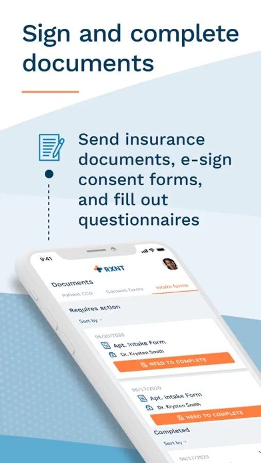 • Documents - Electronically sign and complete documents before, during, and after your appointments. Upload insurance cards and test results, manage health information, sign consent forms, and fill out visit intake questionnaires.