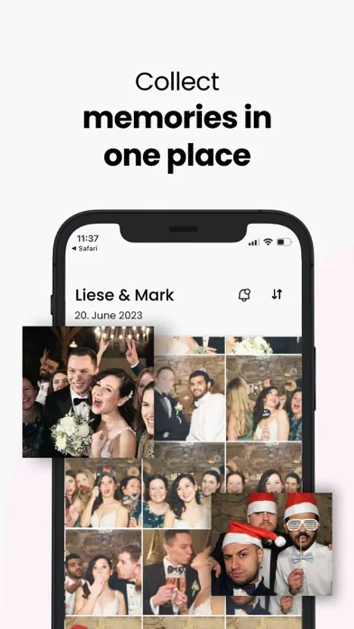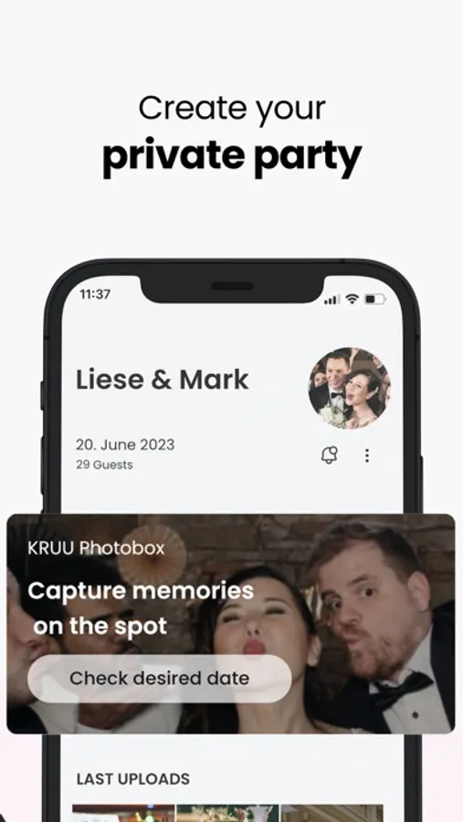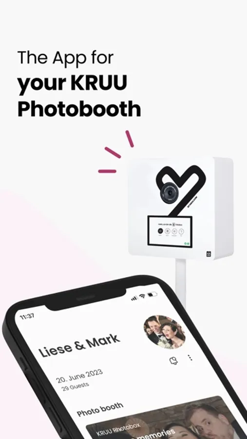 Your KRUU photobooth photos will also be transferred exclusively to the app. Best of all, the basic version is free (minimum 6 months). With our photo app, all the pictures of your guests can be easily shared with each other. Benefit from the many advantages and let your guests share in your happiness.