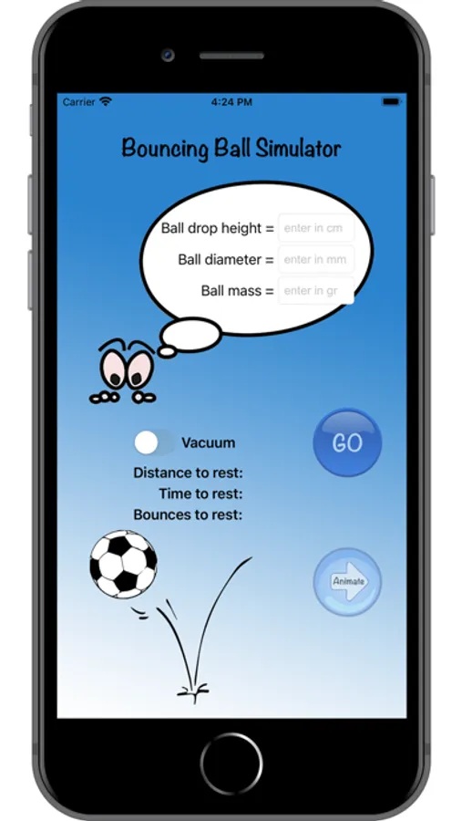 The application simulates a free dropping ball both in vacuum as well as in the atmosphere taking into account air resistance. Drag coefficient is modelled using Schlichting data for flow around a sphere.