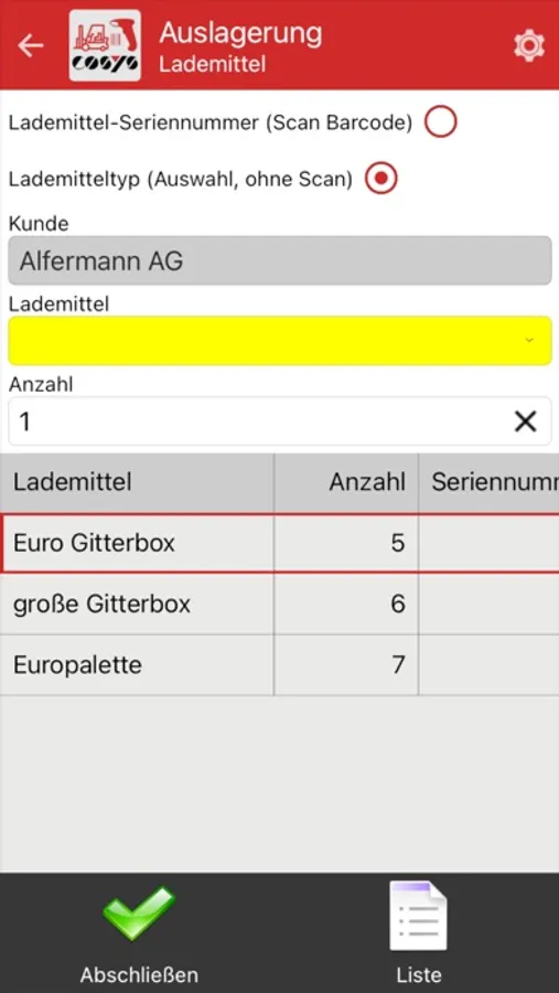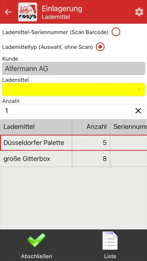 Ein einfacher Barcodescan genügt, falls das Lademittel oder der Behälter mit einer Seriennummer gekennzeichnet ist, um z. B. die Kiste oder den Container zu dokumentieren (Variante 1). Ist kein Behälterbarcode vorhanden, kann der Behältertyp aus einer vordefinierten Dropdown Liste gewählt und die zu erfassende Menge des Lademittels oder Behälters manuell eingegeben werden (Variante 2). Für eine sichere Rückverfolgung wird in beiden Varianten zu Beginn der belastete oder entlastete Kunde ausgewählt.