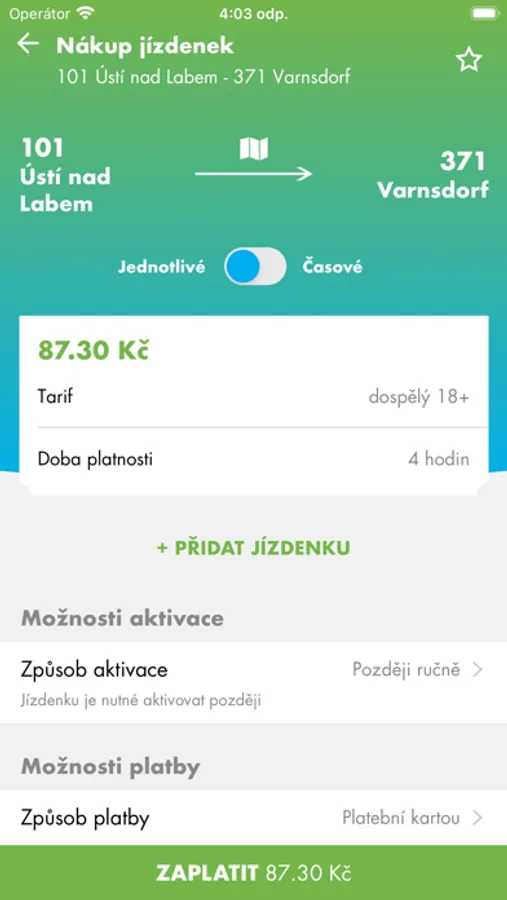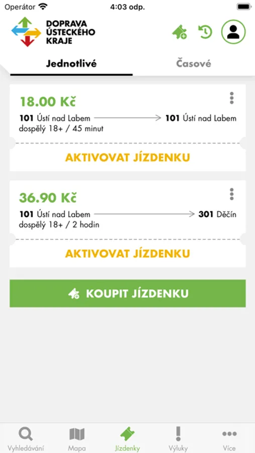 Nákup jízdenek už nemůže být jednodušší, po zvolení konkrétní jízdenky zaplatíte zadáním platební karty. Jízdenky je možné nakoupit i do zásoby a postupně je aktivovat. Pro nákup i aktivaci je nutné být připojen k internetu, kontrola jízdenky probíhá v režimu offline. Jízdenka je platná 1 minutu po její aktivaci. Jednotlivé i jednodenní síťové jízdenky lze zakoupit i bez registrace. Se zlevněnou jízdenkou musí být předložen i potřebný průkaz pro doložení nároku na slevu.