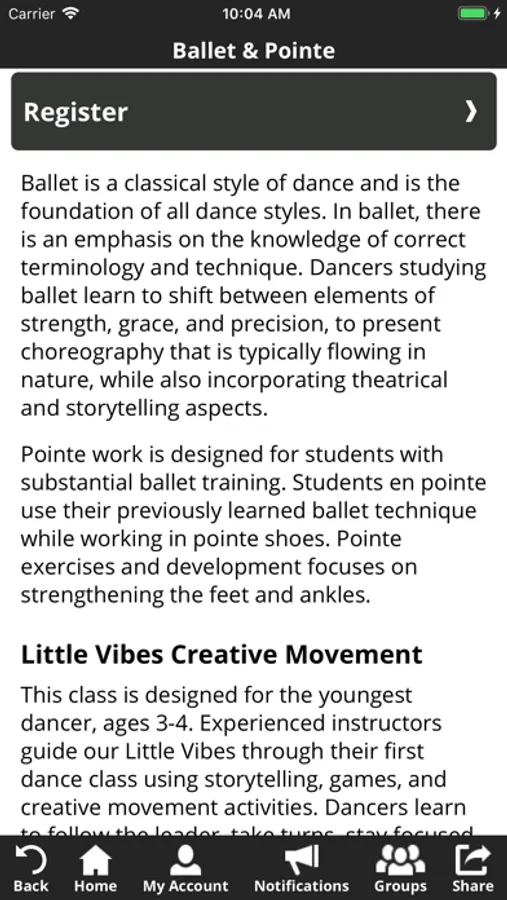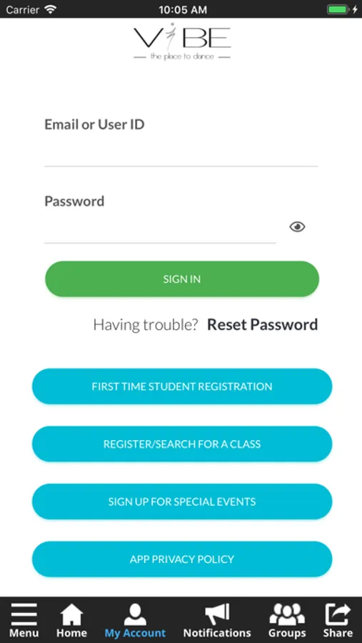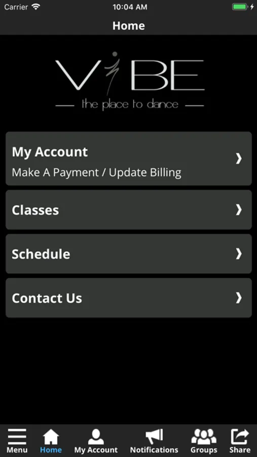 The VIBE app allows you to manage your account with ease, register for classes, parties and special events. You'll also receive important notification about class changes, closings, registration openings, special announcements, and upcoming events.