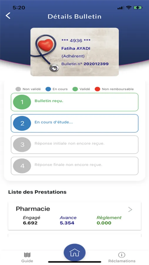 Le collaborateur peut consulter le montant consommé et le reliquat pour l’année en cours, aussi bien pour son compte que pour ceux des membres de sa famille. Il a accès aux détails des bulletins de soins :