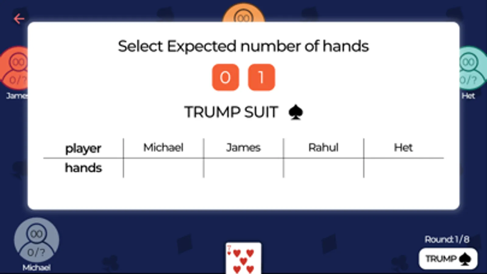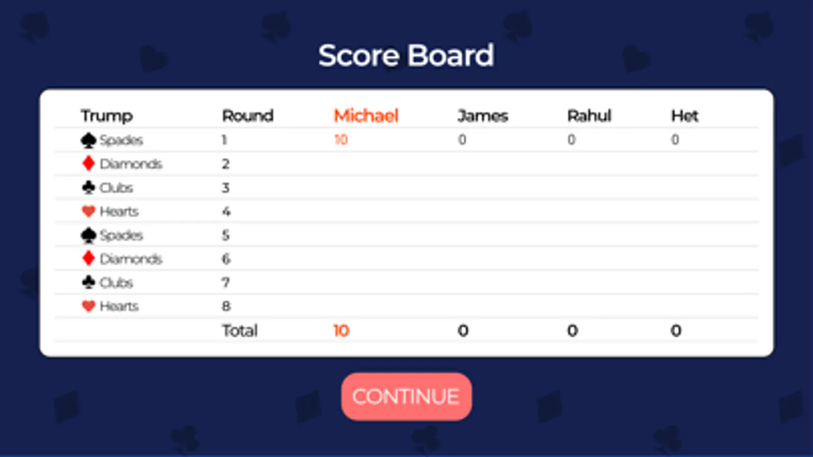 If a player estimated 3 and wins exactly 3 hands, player gets 13 or 30 points depending on settings set by Room Admin