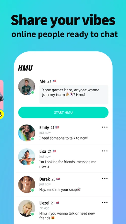 Feeling spontaneous and eager to meet new people right away? Post your interests, hobbies, or plans on HMU (Hit Me Up) and see the messages pouring in from teens who can't wait to join in on the fun!