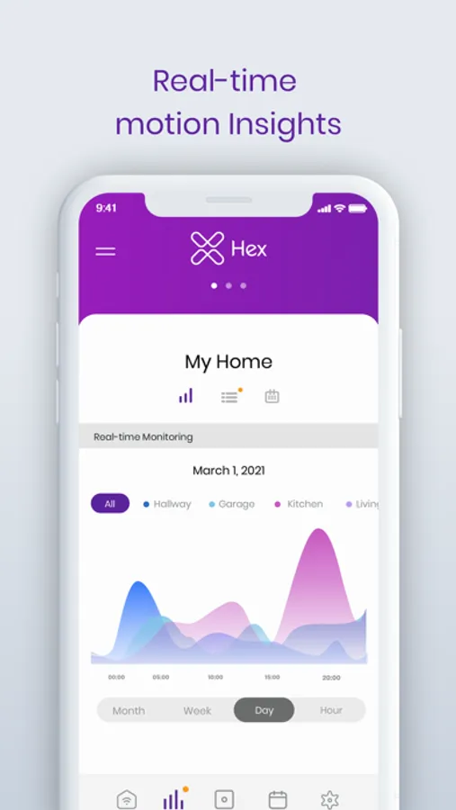 Manage your home from anytime and anywhere with the Hex Home app. Monitor movement throughout your home, arm or disarm your system, auto-schedule modes, and view motion trends of the day, week, and month. Select a digital sensitivity level to filter out pets, people, or even minor motion like a fan blowing a curtain. Say goodbye to false alarms!