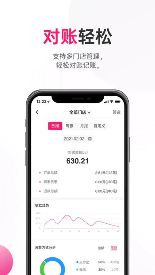 3、可以查看多门店交易数据,轻松对账记账。可以管理到多门店收银员及收银设备的绑定;