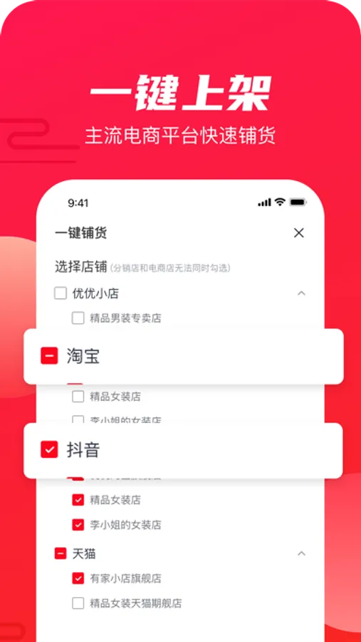 主流电商、直播平台支持一键铺货,降低您的上款成本