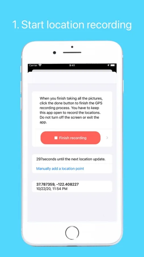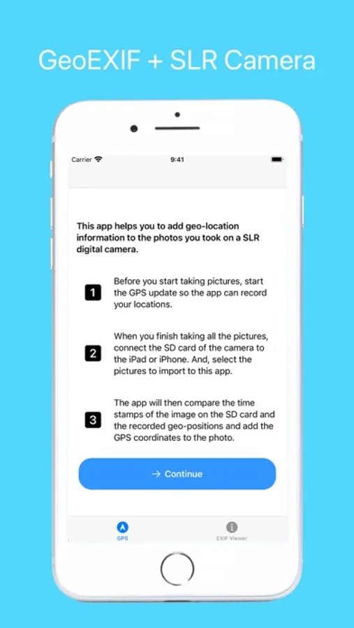Just open the app, turn on location tracking; after taking the pictures with your SLR camera, connect the SD card to the iPhone (or iPad) running the app, and the app will automatically compare the timestamp of the picture to add GPS data.