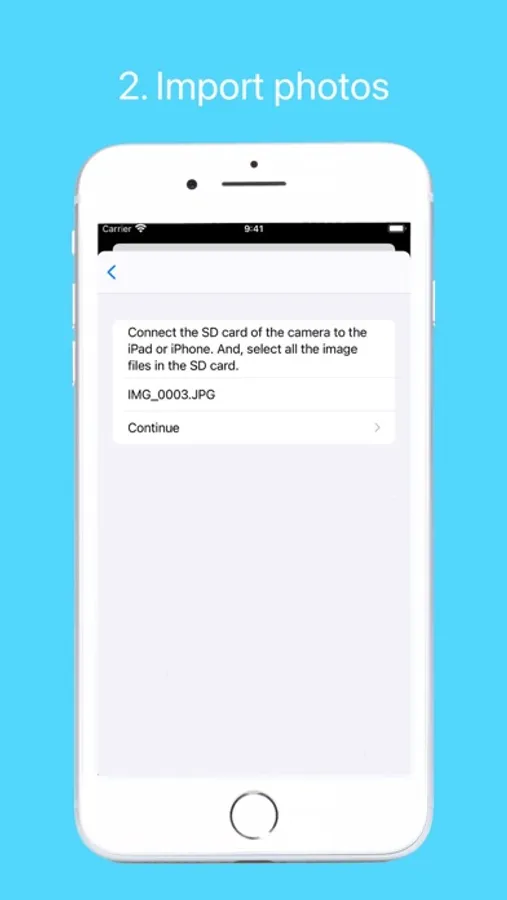 3. When you finish taking all the pictures, connect the SD card of your camera to your iPhone / iPad. Select the pictures with a file selector.