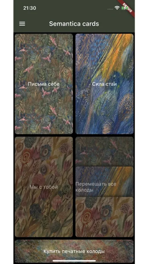 В приложении представлены электронные версии колод “Письма Себе” (66 карт) и “Сила Стаи” (мини-версия 18 карт) - удобная форма любимых наборов, которая всегда под рукой. В любой момент, когда вам нужна подсказка на пути, просто достаньте свой смартфон.
