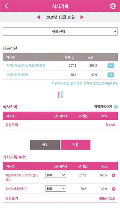 하루 섭취 권장 칼로리에 따른 일별 식단 제공