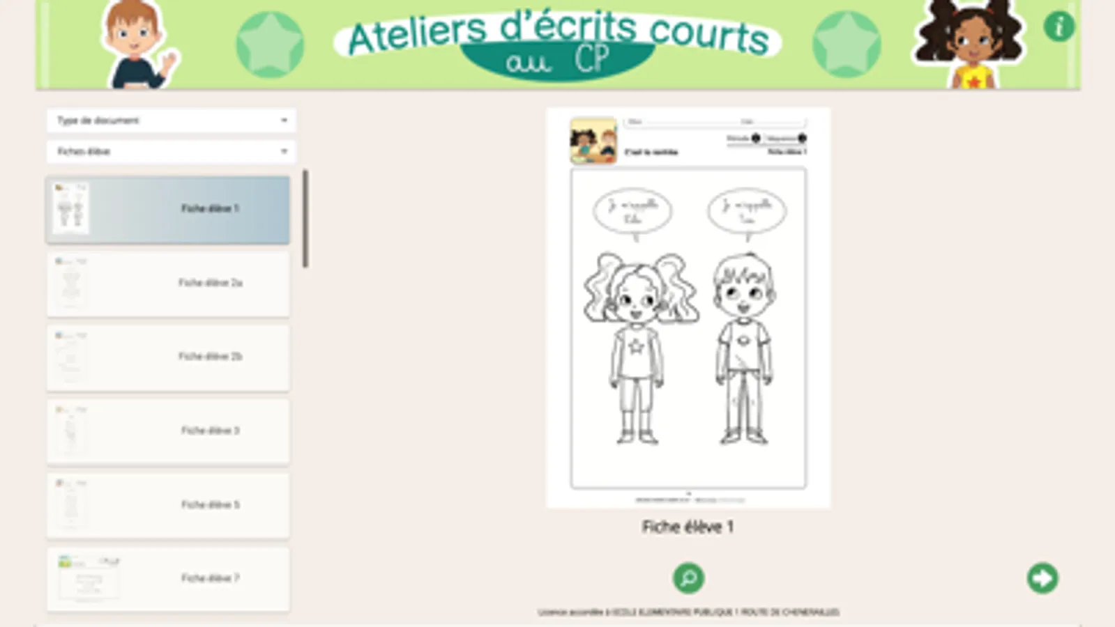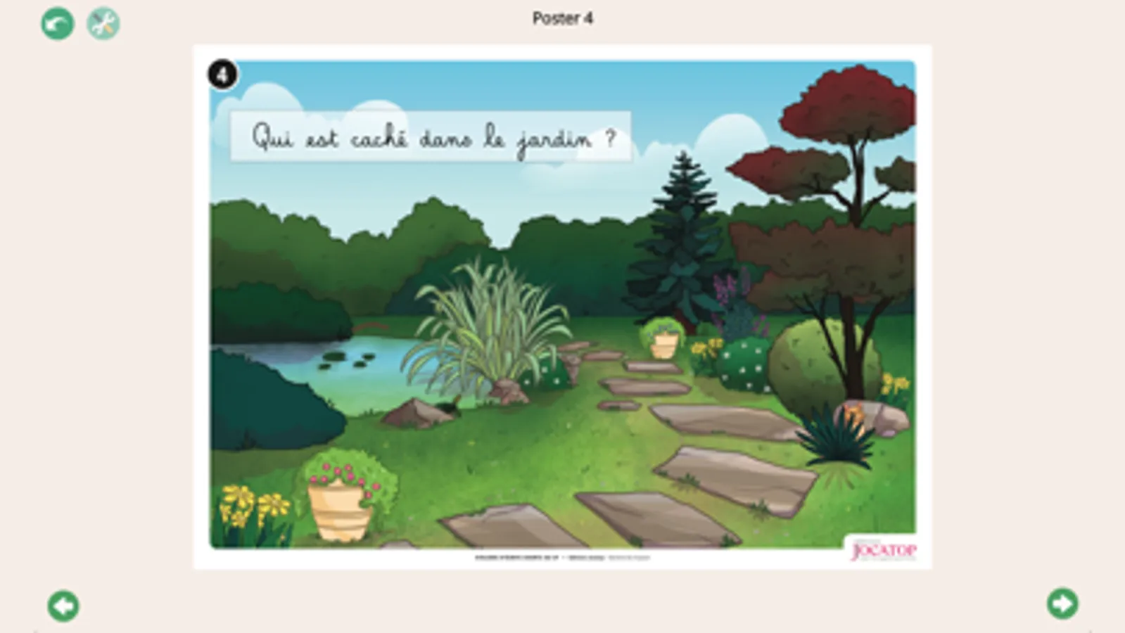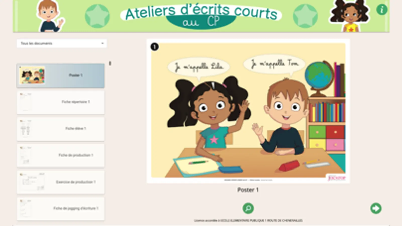 L’application JOCASTORE permet de projeter les posters et les flashcards, ainsi que toutes les fiches pour les élèves : fiches répertoire, fiches de production d’écrit, fiches de jogging d’écriture.
