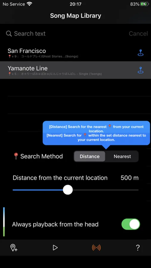 The songs will switch automatically just by moving and approaching the nearest pin or pin within the set distance.