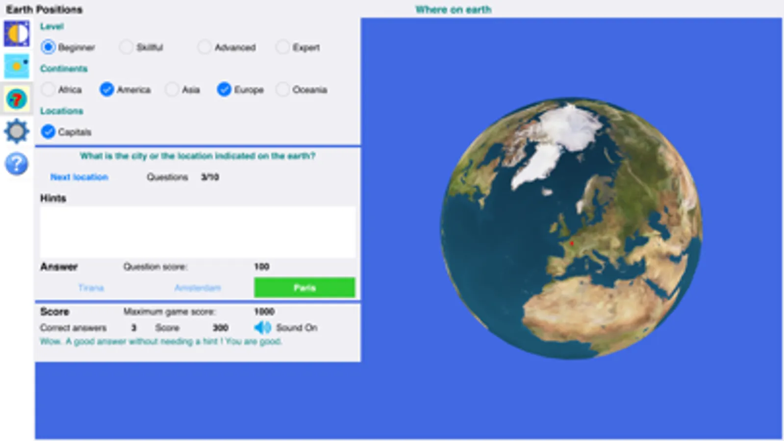 A very attractive geographical game, where you have to guess a location on a 3D-Earth, which rotates and tumbles to display that location in the middle. This game contains 4 levels (beginner, skillful, advanced and expert), 5 continents (Africa, America, Asia, Europe and Oceania) and 4 groups (capitals, large cities, towns and airports). Depending on the game level, you can select your answer from a choice between 3, 6, 9 or 12 locations. You can get additional help by requesting up to three hints. However, a hint lowers the points you can earn when answering the question.
