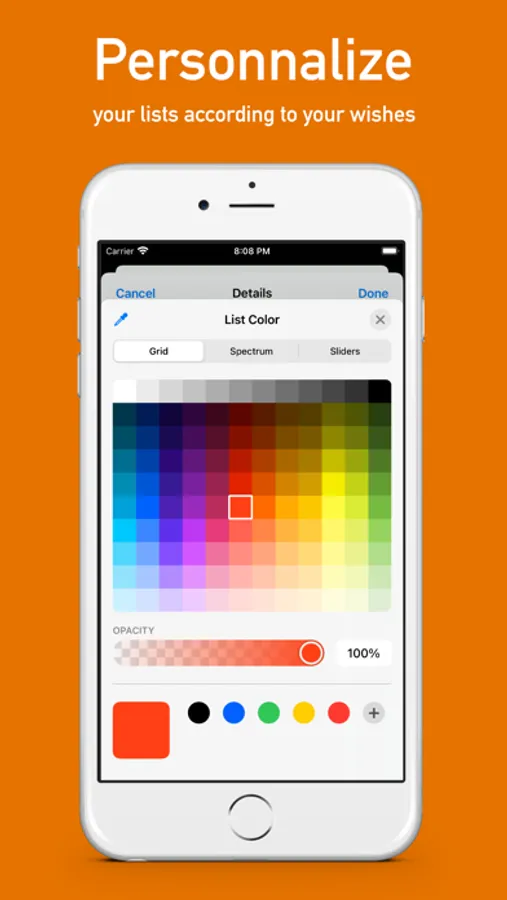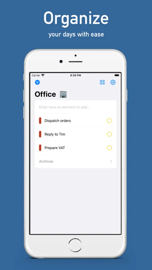 Create your lists by personalizing them with colors and add items to them. Thanks to the filters you can concentrate on a particular list at any time.