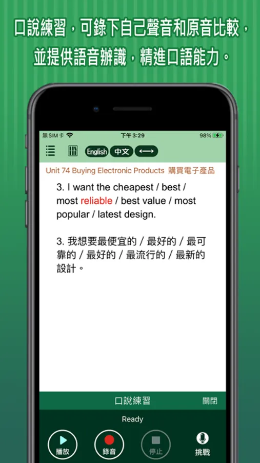 ● 【口說練習】:可錄下自己聲音和原音比較,並提供語音辦識,精進口語能力。