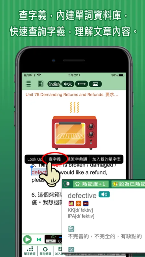 ● 【查字義、聽發音】:內建有聲單詞資料庫,快速查詢字義,理解文章內容。