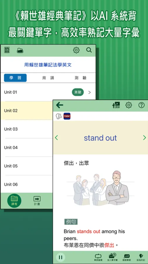 ● 【背誦/學習雙模式】:「背誦模式」是依學習記憶曲線所設計的複習機制,讓所學單字逐步成為長期記憶;您也能使用「學習模式」,進行系統外的複習。
