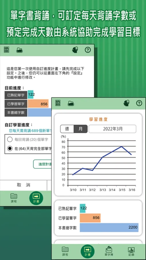 ● 【學習計畫】:設定每天背誦字數或預定完成天數,由系統協助您完成學習目標。