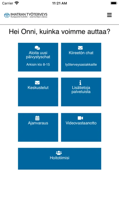 Kulmilla on Imatran Työterveyden asiakkaille tarkoitettu sovellus, jolla voit nopeasti, vaivattomasti sekä tietoturvallisesti olla yhteydessä työterveyshuoltoon ja hoitaa asioita etänä.