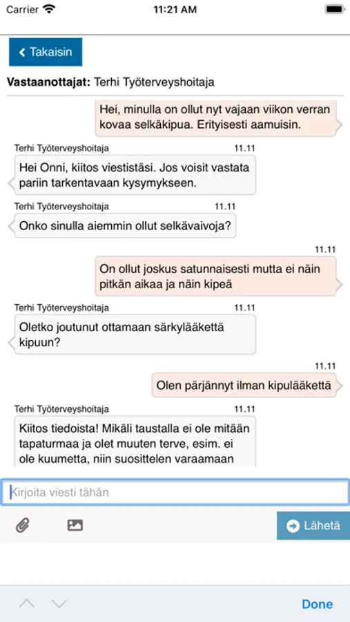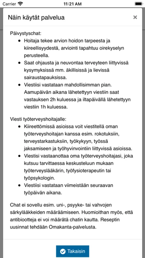 Chat -palvelun kautta saat ohjausta ja neuvontaa terveyteesi liittyvissä kysymyksissä mm lievissä sairastapauksissa sekä voit kiireettömissä asioissa viestitellä oman työterveystiimisi kanssa esimerkiksi rokotuksiin, terveystarkastuksiin, työkykyyn, työssä jaksamiseen ja työhyvinvointiin liittyvissä asioissa.