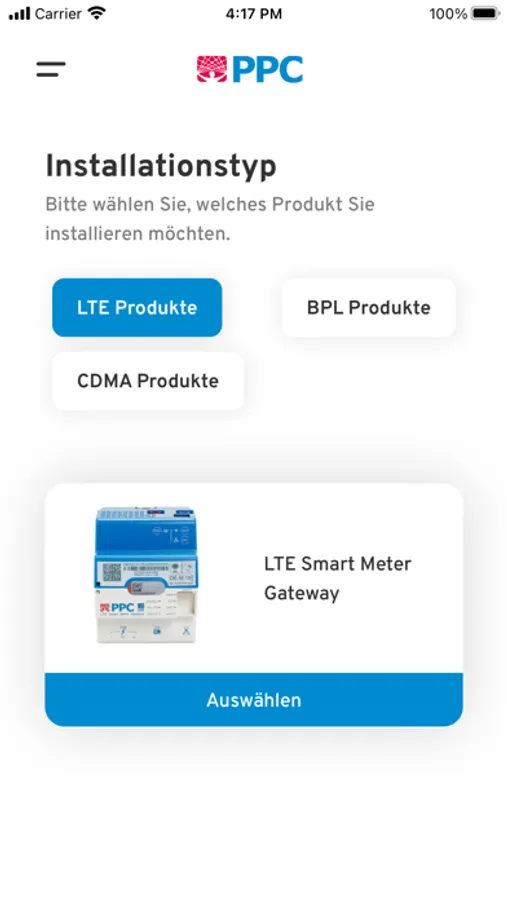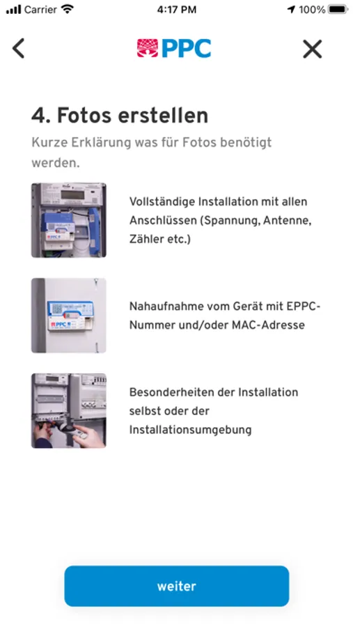 In der App lassen sich die verschiedenen zu installierenden Gerätetypen (LTE, BPL, CDMA) auswählen. Während der Inbetriebnahme werden die Geo-Position sowie Fotos der Installation erfasst und an das NMS übermittelt. Als Hilfestellung kann die integrierte Einbauanleitung genutzt werden. Darüber hinaus erhält der Elektriker eine Rückmeldung über die erfolgreiche Inbetriebnahme des Geräts in Form von Latenz und Signalqualität / Trace.