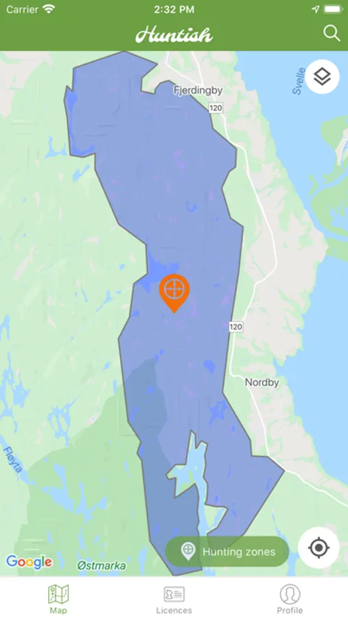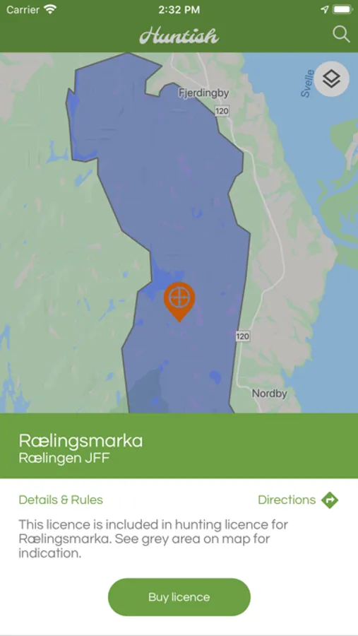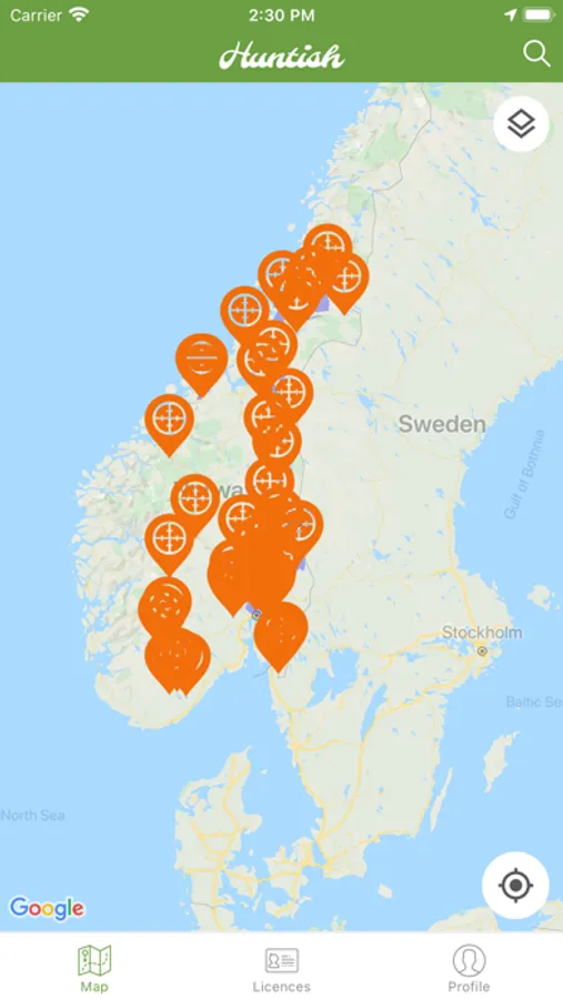 - Tydelige markører på kartet viser hvor du kan kjøpe jaktkort via Huntish over hele landet.