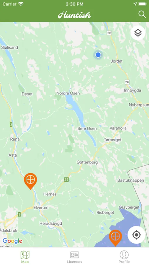 Kartet i appen presenterer markører som viser deg hvor det finnes jaktområder. Klikk på markør vil ta deg videre til prosessen for kjøp av jaktkort for ønsket område.